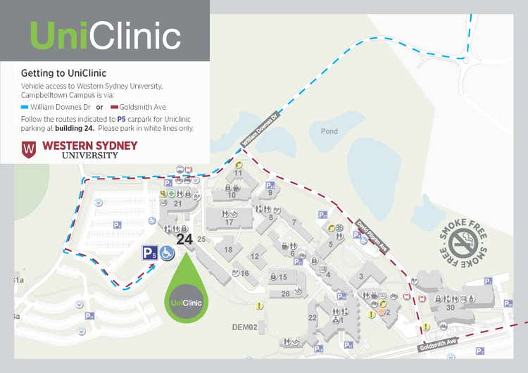 The Uniclinic is located in Building 24 of the Western Sydney University, Campbelltown campus. Access to the campus is via Narellan Road, Campbelltown.