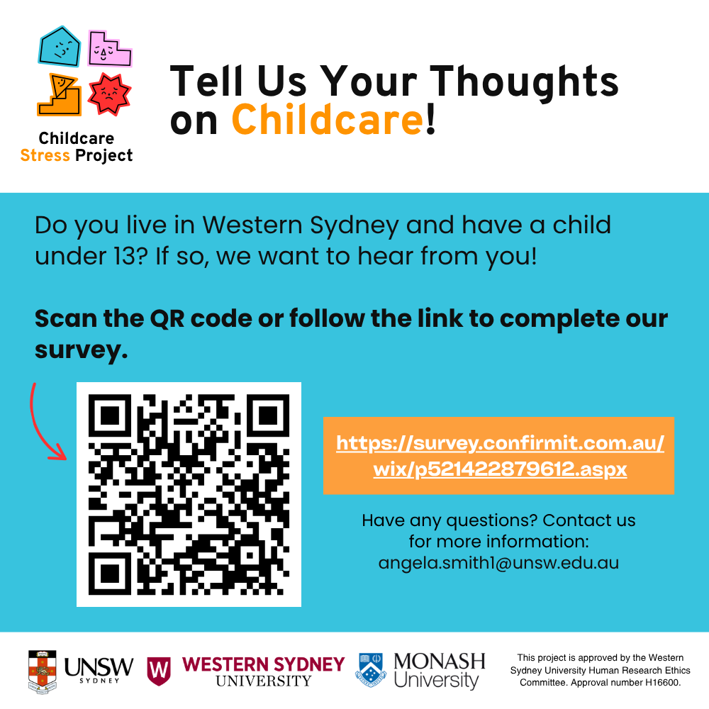 We want to hear about your perspectives of childcare in the Western Sydney region in an online survey. Your experiences will shape understandings of childcare stress and build a measurement tool to help improve policy on childcare.