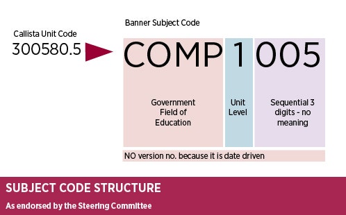 The University Executive, Project Steering Committee and Project Working Group have endorsed the recommended approach to new unit coding as part of the new SMS implementation. The Unit Codes used in our current Student Management System (Callista) are 6 digit numbers which have some meaning built in for administrative staff but this meaning is not obvious to students or other staff.