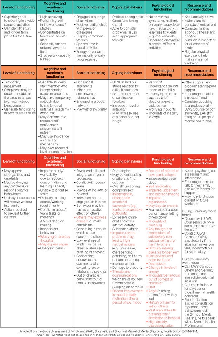 The red guidelines represent changes which are known to increase distress to themselves or those in their family and workplace. If you identify these changes in yourself or others, it is important to discuss a plan with the Counselling Service (for students), supervisor, HR or EAP (for staff members). People can also discuss the issues with their GP who can recommend additional support via the Medicare mental health plan.