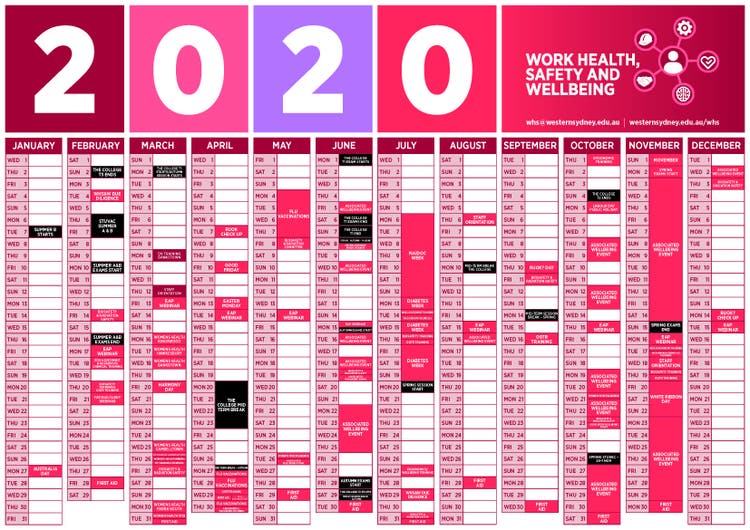 The Work Health and Safety Unit have developed a calendar of various Health and Wellbeing Events scheduled to take place throughout the year. The events focus are aligned with the results of the MyVoice Survey and Get Healthy at Work Survey and aim to raise awareness of important causes and on improving the overall health and wellbeing of the Western Community.