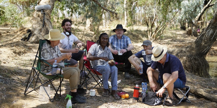 Members of the Other Worlds research team with Mr Clarence Walden. From L-R: Prof. Alexis Wright, A/Prof. Ben Etherington, Mr Clarence Walden, Prof. Anthony Uhlmann, Dr Ben Denham and Tolly.
