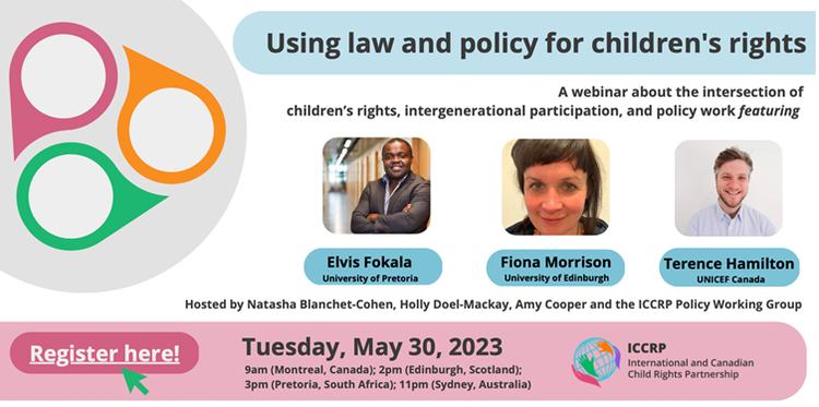 Hosted by Natasha Blanchet-Cohen (Concordia University, Canada), Holly Doel-Mackaway (Macquarie University, Australia) and the Policy Working Group of the International and Canadian Child Rights Partnership, this webinar will feature an international panel including Elvis Fokala (Centre for Human Rights, University of Pretoria), Terence Hamilton (Domestic Policy Specialist, UNICEF Canada), and Fiona Morrison (University of Edinburgh, Scotland).