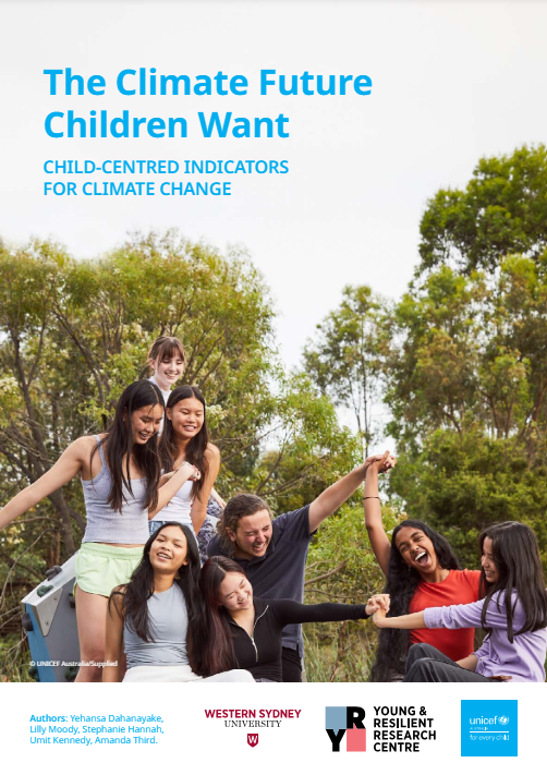 From here, UNICEF Australia and the Young and Resilient Research Centre will be working to promote the report and the use of the Child-Centred Climate Indicators to policymakers, educators, healthcare professionals, parents, and young people with the aim of enabling real-life improvements for young people, now and in the future with a view to stopping and ultimately reversing the effects of climate change.