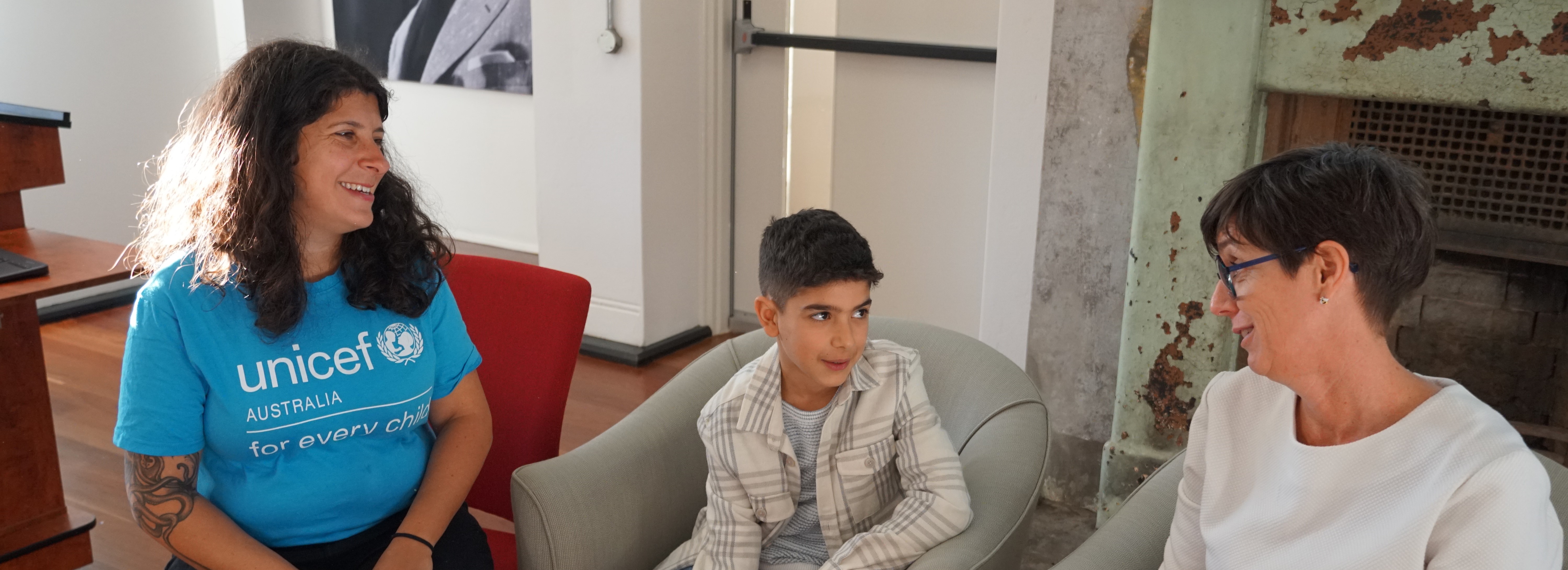 Image: UNICEF Australia's Child and Youth Engagement Manager Freya Conomos, Adam (an 11-year-old Child Parliamentarian), and Kelly Pfeiffer, Director for Design Education at Digital Influx and Zoo Education Officer.