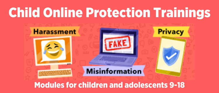 This project promotes a holistic approach to child online protection to build safe, gender-sensitive, age-appropriate, inclusive, and rights respecting digital environments for children and young people worldwide. The online self-paced trainings we developed are aimed at children (aged 9-12, 13-15 and 16-18) and cover the topics of Harassment, Mis/Dis information and Privacy.